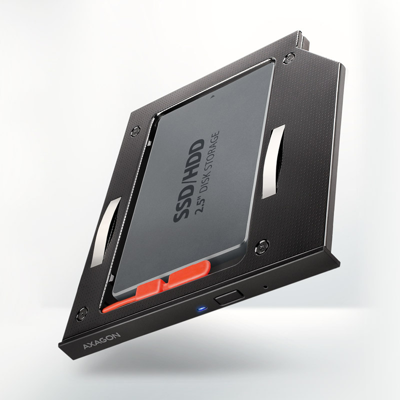 The AXAGON RSS-CD09 internal frame is designed to be mounted instead of the existing 9.5 mm CD/DVD drive. It is designed for 2.5″ SSD/HDD SATA drives. You can easily replace the optical drive in your laptop with a hard drive.