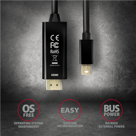 Mini DisplayPort -> HDMI active cable – adapter AXAGON RVDM-HI14C2 to connect HDMI monitor/TV/projector to the computer with the Mini DisplayPort output.