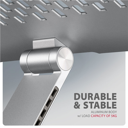 The entire arm can rotate freely, allowing you to easily share or reposition your device without moving the stand. The robust aluminium construction offers high stability and securely supports devices up to 5 kg. The non-slip coating prevents unwanted slipping and protects the underside of your laptop.