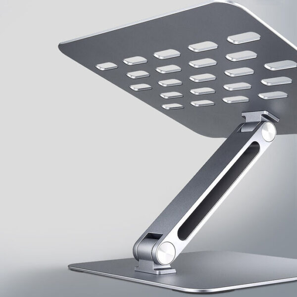 Foldable laptop or tablet stand, for devices from 10 to 16 inches, made of aluminium, two hinges for stepless height and angle adjustment.