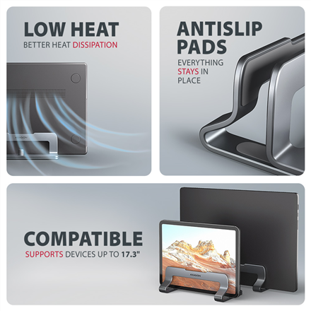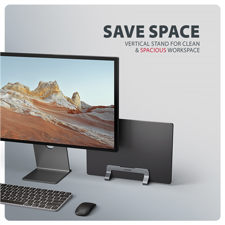 The AXAGON STND-VG is an elegant vertical stand for notebooks and tablets, designed to keep your workspace tidy. It is suitable for devices from 10 to 17.3 inches and is aimed at users who want to save space, create order, and securely place their device at the same time.