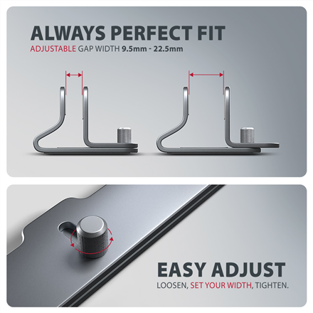 The adjustable width allows use with notebooks or tablets of different thicknesses. A precise adjustment screw reliably fixes the chosen width. This ensures your device always stands stable and secure.