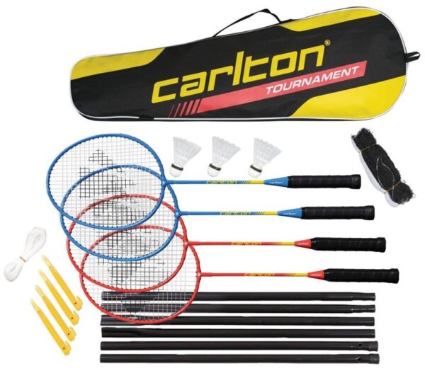 Prekės ženklas- Carlton. Spalva- Mėlyna, Balta, Juoda, Raudona, Geltona. Medžiaga- Nailonas, Aliuminis, Plastikas. Badmintono prekės tipas- Raketė, Skraidukas, Dėklas, Tinklas. Privaloma garantija- 24 mėn. Papildoma informacija- 4 žaidėjams. 4 raketės. Tinklelis. Stulpeliai. 3 plunksninukai C10. Dėklas.
