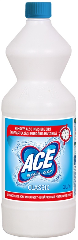 Prekės ženklas- Ace. Modelis- Regular. Tūris- 1 l. Naudojimas- Nepaisant baltų drabužių balinimo, ACE yra tinkamas valyti sunkiai prieinamus ir išvalomus paviršius. ACE galima valyti emaliuotus paviršius, marmurines grindis. ACE netinka valyti metalus bei vinilinius ar guminius paviršius, kuriuos jis gali pažeisti. Jeigu netyčia, pradėjote valyti tokius paviršius su ACE – kuo skubiau nuvalykite ir nuplaukite vandeniu. Prieš naudojimą, visada perskaitykite informaciją etiketėje. Prieš naudojimą išbandyti ant mažos valomo paviršiaus dalies, įsitikinti ar valomas paviršius nepažeidžiamas. .
