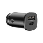 Baseus car charger with a built-in, retractable cable with a Lightning connector and a USB-C port. It guarantees fast and efficient charging of any portable device.