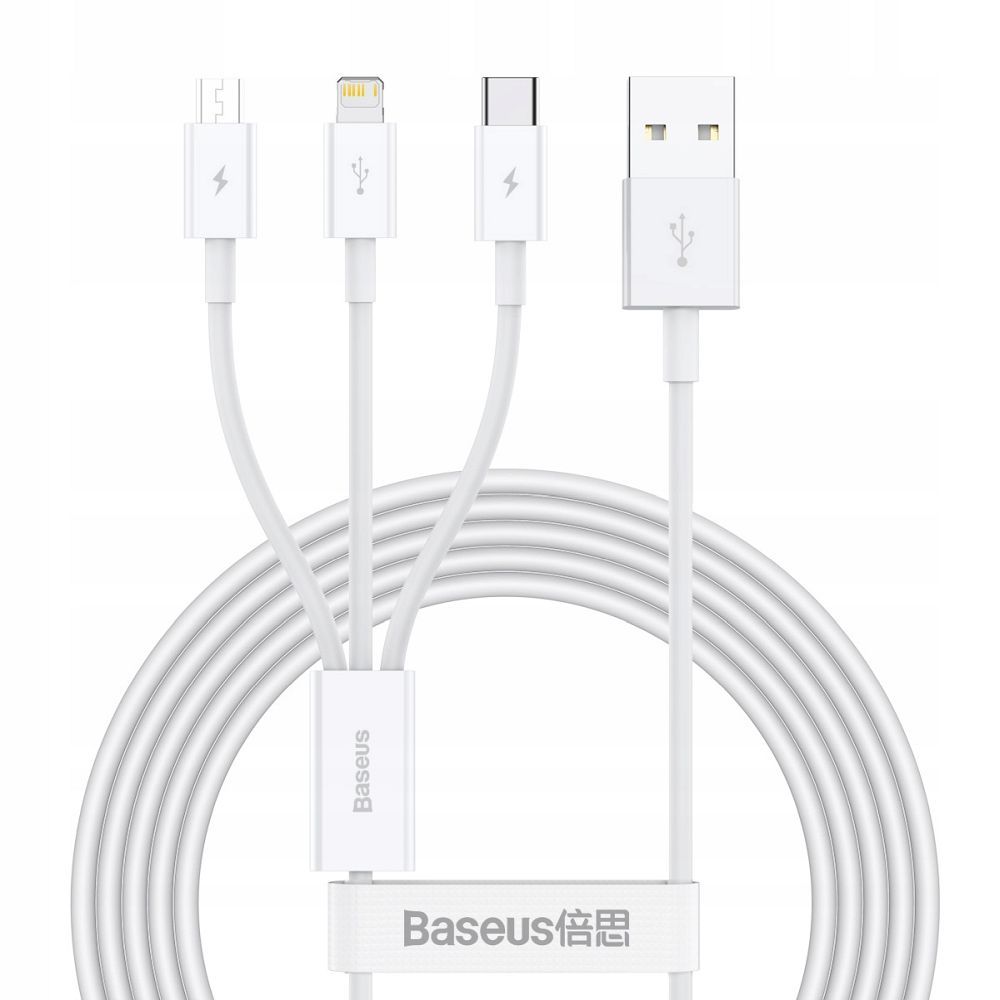 Specyfikacja Marka: Baseus Wtyczki: USB / USB Typ C / micro USB / Lightning Materiał: ABS + TPE Natężenie: 3,5 A (max) Długość: 1,5 m Funkcje: ładowanie / przesyłanie danych Kompatybilność: urządzenia z portami USB Typ C / micro USB / Lightning