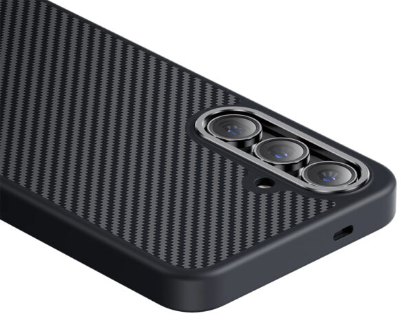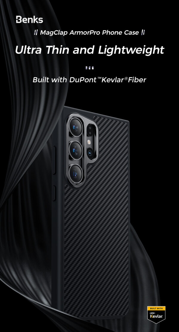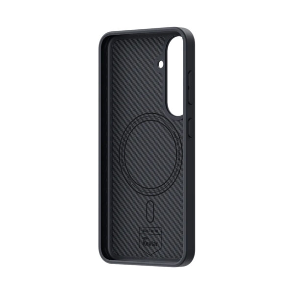 Etui wykonane z zaawansowanego materiału kompozytowego, łączącego włókna Kevlar® (600D + 1500D) przy użyciu technologii 3D. Tworzy to solidną i stylową strukturę o eleganckiej teksturze 3D Micro-Relief, która poprawia chwyt oraz dodaje wyjątkowego stylu.