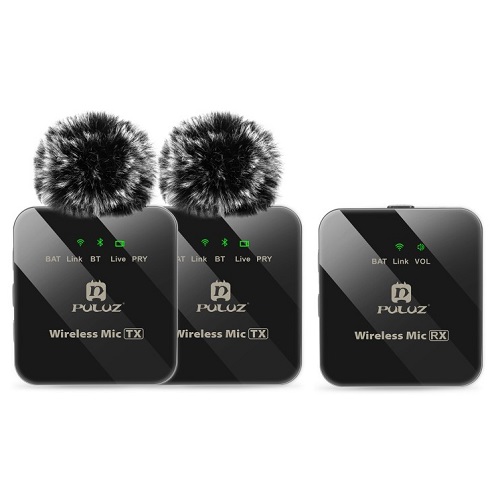 Visakryptis, belaidis dvigubas mikrofonas, 2.4GHz BT, veikia 10m atstumu, baterijos trukmė virš 10 val., talpa 300mAh, du siųstuvai, vienas imtuvas, 3.5mm audio kabelis, OTG kabeliai USB Type-C, Lightning