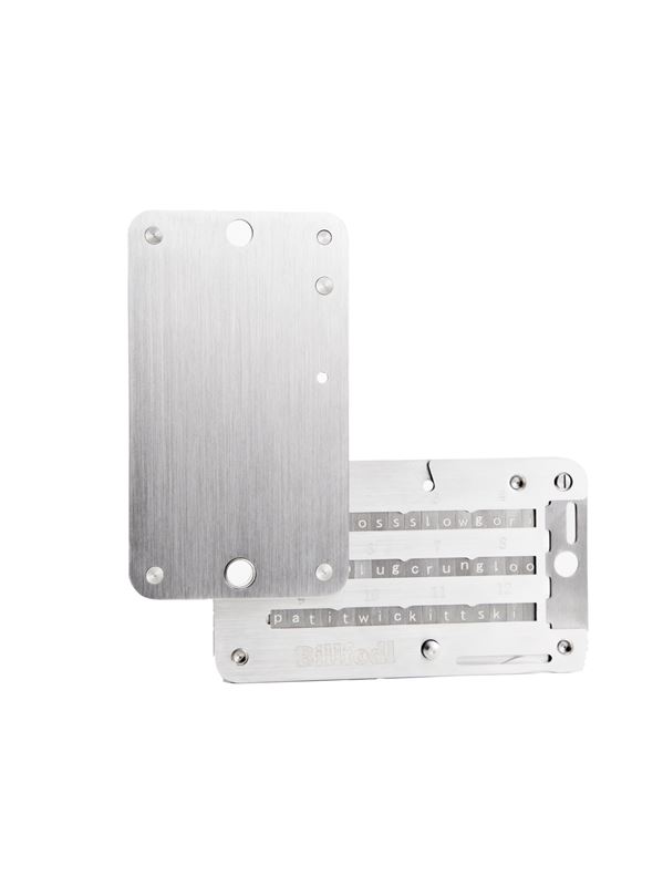Billfodl is the most secure way to store your crypto wallet backup offline, safe from hackers and acts of god. Using a randomized set of character tiles, you recreate your recovery phrase in the steel unit, creating an almost indestructible back up. Works best with Crypto wallets like Ledger and Trezor.