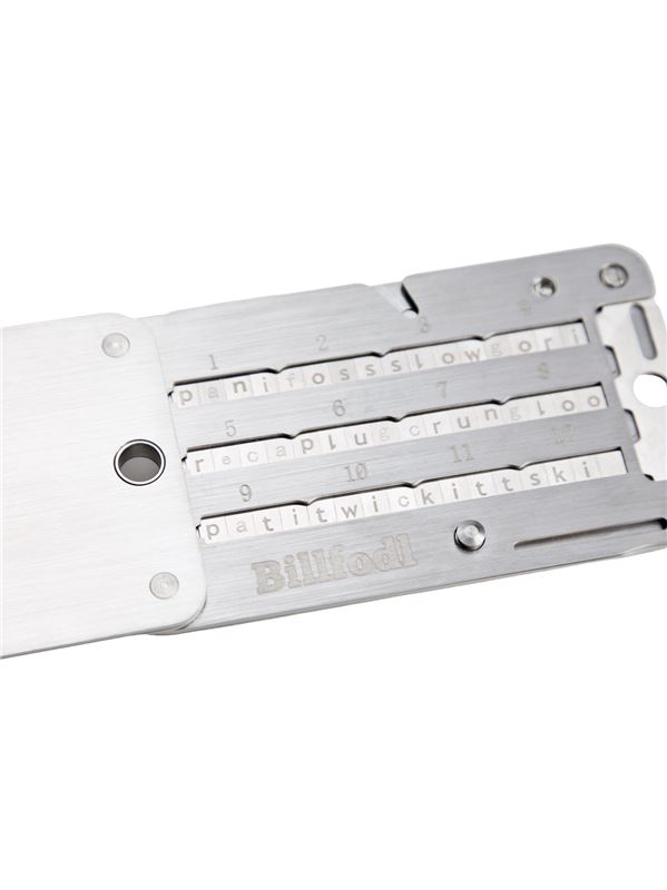 | Each Billfodl package comes with the main steel unit or chassis and a set of over 300 character tiles. After you have received you 12 or 24 word recovery phrase (otherwise known as a recovery seed, seed phrase, or mnemonic phrase), you will open your Billfodl and the provided pack of character tiles and you will spell out the first four letters of each word and slide them into the main unit. The Billfodl main unit has labels above each slot so you know which word of your seed goes where. |