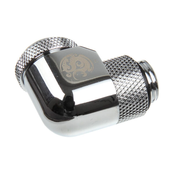 Multi-link adapter in shiny silver by Bitspower with 90-degree angle, rotatable G1/4-inch external thread & fixed G1/4-inch internal thread