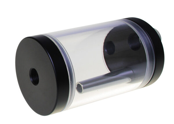 This is a model from Bitspower with two screwed POM caps. These are sealed against the acrylic tube with two rubber rings. The tube is comparably thick and therefore particularly stable. The upper cap of the Reservoir, which is normally installed vertically, has a single G1/4 inch thread.