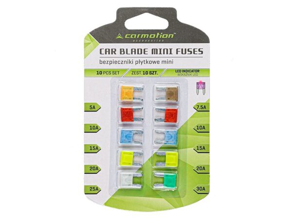 Fuses are used to protect electrical circuits against overload. Fuses of different power are used depending on the circuit. Set includes 10 fuses: