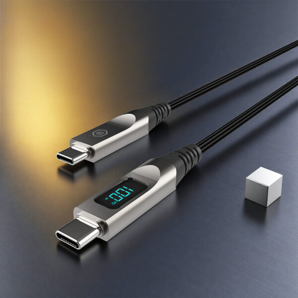 Blavec Kabelis Lumix pleciony – Typ C na Typ C – PD 100W 5A LED display 1,2 metra Apple CarPlay/Android Auto (CLU-CC5BG12)