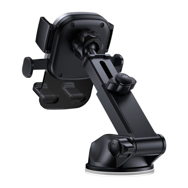 - Automatyczny mechanizm zaciskowy – Po wciśnięciu bocznych przycisków uchwyt automatycznie rozszerza ramiona. Aby stabilnie zamocować telefon, wystarczy go włożyć, a ramiona same się zacisną, blokując urządzenie w miejscu.