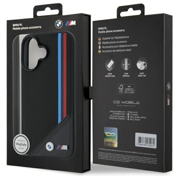 BMW BMHMP16S23PUTRK Apple iPhone 16 6.1″ dėklas telefonui juodos spalvos hardcase M Meshed Tricolor Stripes MagSafe