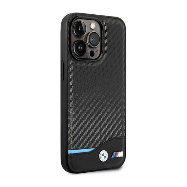 BMW Leather Carbon Blue Line MagSafe – dėklas skirtas Apple iPhone 14 Pro Black