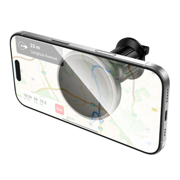 The BH224 Flash model is mounted directly on the car air vent, keeping the phone within the driver’s line of sight for safer driving. The built-in wireless charger supports up to 15W output, providing fast and secure charging for compatible devices. The magnetic mounting system works perfectly with MagSafe-enabled phones and magnetic cases, ensuring a firm and stable hold while driving.