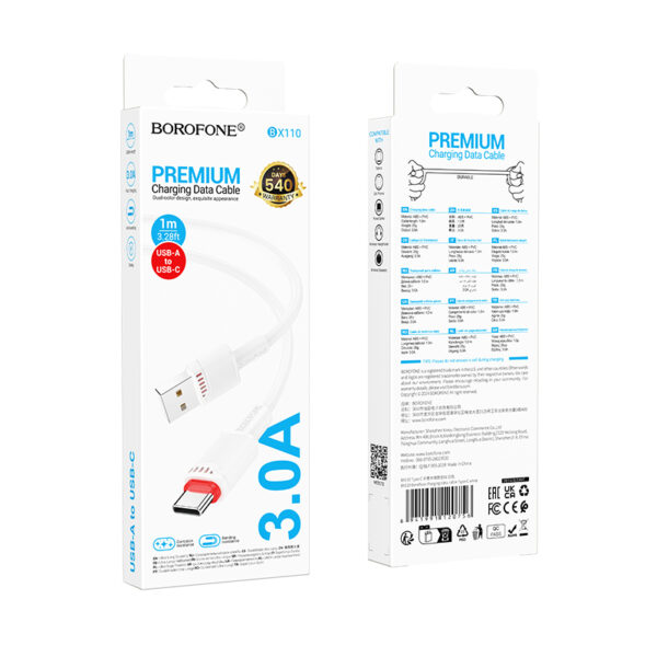 Borofone kabelis BX110 Beneficio – USB į Typ C – 3A 1 metras baltos spalvos