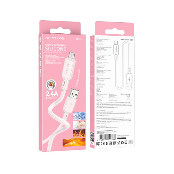 Borofone Kabelis BX94 Crystal color – USB į Micro USB – 2,4A 1 metras light pink