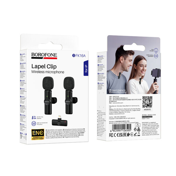 Borofone BFK16A Winner Wireless Lavalier Microphone Lightning – black is a dual wireless microphone set designed for interviews, podcasts, live streaming, and video content creation. With its digital Lightning connector and stable wireless transmission, it ensures convenient operation and high-quality audio recording.
