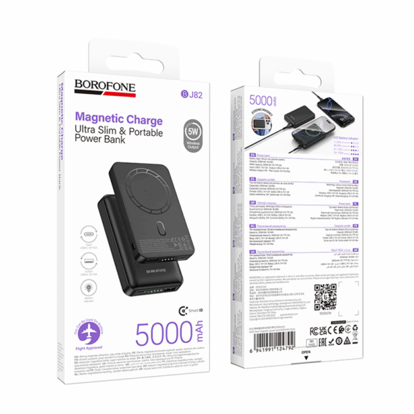 Borofone Power Bank 5000mAh BJ82 Dawn – USB – magnetic with wireless charging – black is a compact and stylish power bank combining modern design with wireless convenience.