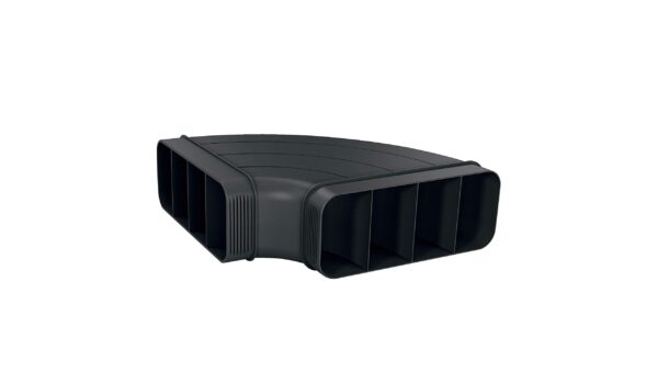- 90° plokščias lenktas kanalo elementas (kištukinis), horizontali konfigūracija. Optimizuota aerodinamika iki minimumo sumažina slėgio nuostolius ir padidina srauto greitį. Lengva pjaustyti ir lengva sujungti naudojant lizdinį jungiamosios movos elementą. Elementas atitinka adatinės liepsnos bandymą (pagal IEC 60695-5-11), V2 degumo klasę (pagal UL94) ir B1 statybinių medžiagų klasę (DIN 4102-1)