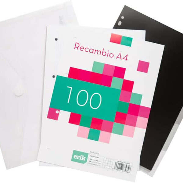 The binder has 4 rings, a rubber band closure and a personalised interior: 100 A4 sheets, a transparent plastic envelope, 4 tabs.