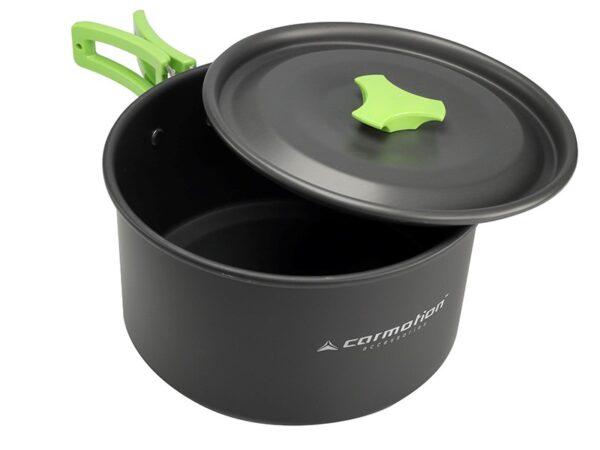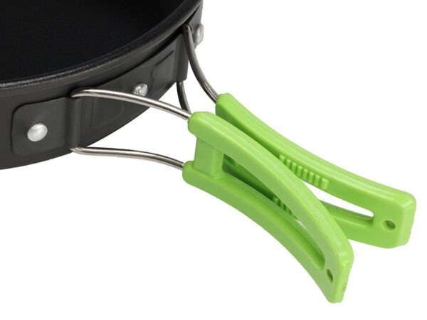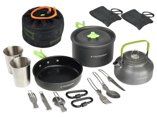 A 15-piece camping cookware set. The product is perfect for camping and traveling, useful in the garden during a barbecue and even in the car. The whole thing can be packed into the included bag and then attached to a backpack.