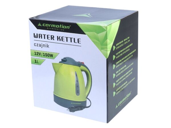 1L car kettle. Voltage: 12V. Power: 150W. The kettle is perfect for cars, trucks, buses, boats and campsites. The heating element is placed in the base. The cable is 150 cm long and has a plug with a diode and a fuse. The kettle will turn off automatically when the water boils.