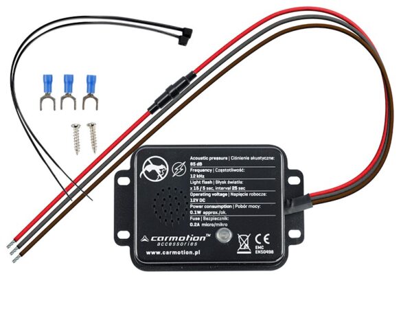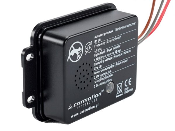 A repellent against martens and rats for car batteries. The marten and rat repellent emits a 12 kHz sound every 15 seconds.