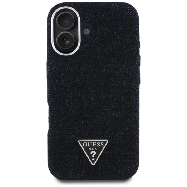 Dėklas Guess Denim Triangle Logo MagSafe skirtas Apple iPhone 16 juodos spalvos