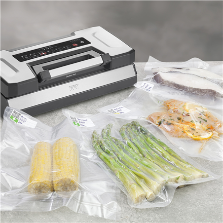 | Priedai pridėti | 2 vacuum rolls (20×300 cm, 30×300 cm), 10 stand-up bags (5x 20×30 cm, 3x 25×35 cm, 2x 30×40 cm), Vacuum hose for suitable vacuum containers, Food Manager sticker + Food Manager app |