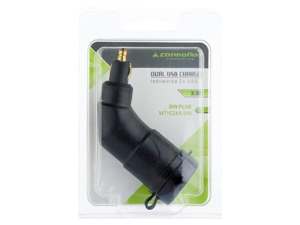 Charger is perfect for all vehicles equipped with a DIN 12/24V DC cigarette lighter socket – in trucks, vans, motorhomes and motorbikes. It is designed to operate in unfavorable weather conditions – in the event of rain it is enough to close the rubber plug. It has two USB ports with a total power of 3.3A.