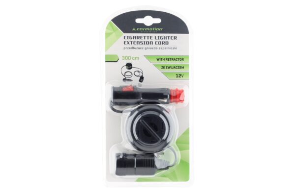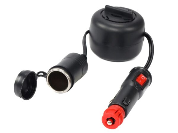 Cigarette lighter socket extension is designed to extend the reach of devices. The built-in extension cord reel ensures convenient use, storage and transportation. The extension includes a switch with LED and a fuse.