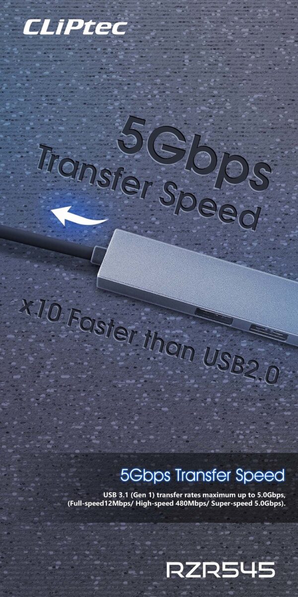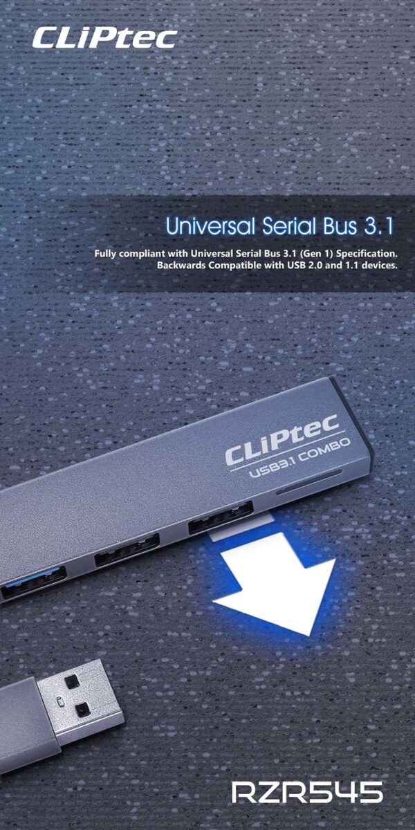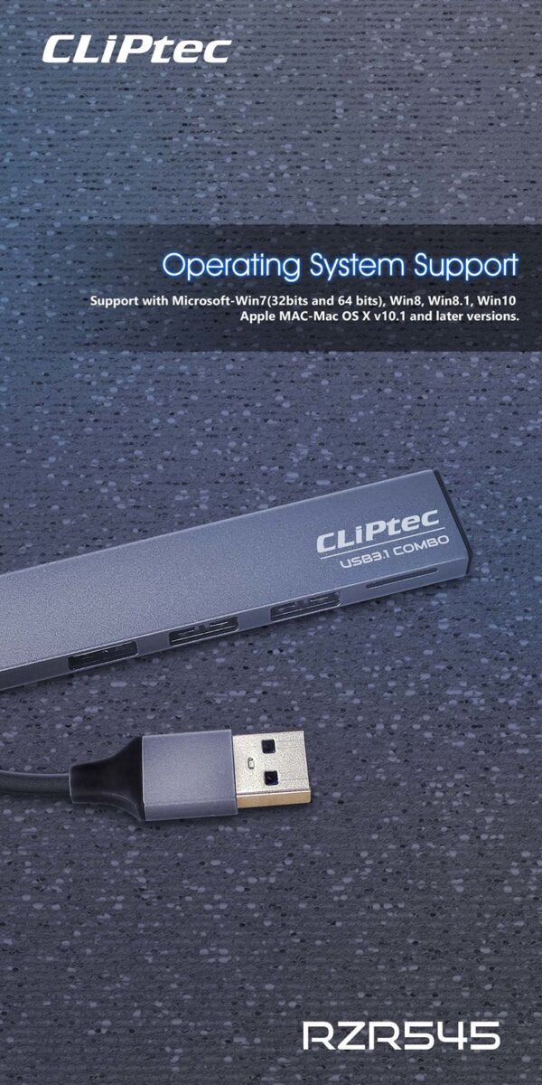CLiPtec RZR545 USB3.1 3Ports Hub with Card Reader allows you to connect different USB devices to the OTG enabled Android devices and also compatible with windows based notebook USB port. The RZR545 has a built-in Micro SD memory card reader that can access the most popular memory cards and the 3 USB ports allow you to connect the mouse and keyboard to your Android device and let it be a portable PC. This combo card reader is a slim profile with only 7mm thick which can easily handle and storage