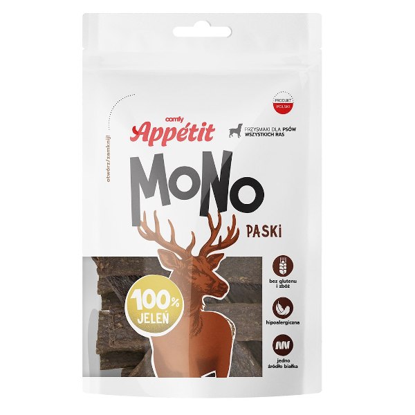 „Comfy Appetit MONO“ – tai monoproteininiai skanėstai (kiekvienam variantui po vieną gyvūninės kilmės baltymą), sukurti šunims, kuriems svarbi paprasta sudėtis ir geras toleravimas. Priklausomai nuo skonio, skanėstų sudėtis yra 100 % mėsos arba 99 % mėsos + 1 % glicerino (tinkamai tekstūrai). Linija yra trijų praktiškų formų: mini kubeliai (apie 11–12 mm), dideli kubeliai (apie 16 mm) ir juostelės – todėl lengva pasirinkti apdovanojimo formatą pagal šuns dydį ir progą (dravimas/vedžiojimas/namai). MONO JUOSTELĖS – IŠ ELNIENOS (80 g). Elniena yra žvėriškas skanėstas su itin intensyviu aromatu, kuris dažnai veikia kaip „turbo apdovanojimas“, ypač šunims, kurie greitai praranda susidomėjimą standartiniais skanėstais. Informaciniame lapelyje pažymima, kad ši mėsa paprastai yra liesesnė, todėl tai gali būti geras pasirinkimas, kai norite sumažinti riebalų kiekį apdovanojimuose, kartu išlaikant labai gerą skonį. Elniena taip pat yra natūralus mikroelementų šaltinis – geležies ir cinko, be kitų, kurie svarbūs imunitetui ir bendrai būklei. Monoproteininis elnienos receptas puikiai tinka eliminacinėms dietoms ir baltymų rotacijai, kai norite paprastos, kontroliuojamos formulės. Forma: Juostelės – „ilgiau veikianti“ forma: galite duoti didesnį atlygį arba lengvai padalyti juostelę į mažesnius gabalėlius. Santrauka: Svoris: 80 g Sudedamosios dalys: 100 % elnienos (mėsa ir gyvūninės kilmės produktai). Analitinės sudedamosios dalys: žali baltymai 47,1 %; žali riebalai 19,3 %; žalia ląsteliena 2,2 %; žali pelenai 14,6 %; drėgmė 9,4 %. Šėrimo rekomendacijos Duokite skanėstą visą dieną kaip užkandį arba atlygį. Porcijų skaičių koreguokite pagal savo šuns poreikius, dydį ir būklę, neviršydami 10 % dienos mitybos poreikio. Visada stebėkite savo šunį, kai jis ėda, ir užtikrinkite, kad jis turėtų nuolatinę prieigą prie šviežio vandens. Atidarę produktą, sandariai uždarykite maišelį. Laikyti kambario temperatūroje, tamsioje ir sausoje vietoje. Skanėstas netinka vartoti žmonėms. Skirta vyresniems nei 4 mėnesių šunims.