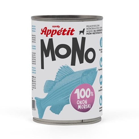 „Comfy Appetit MONO 100% vieno baltymo konservai iš jūros ešerio. „MONO“ linija – tai unikalus pasirinkimas augintiniams, turintiems mitybos poreikių. Begliutenė ir begrūdė formulė idealiai tinka šunims, turintiems alergiją maistui, o kaip hipoalerginis maistas, jis maksimaliai palaiko jūsų augintinio sveikatą. Dėl monoproteininės sudėties ir natūralių ingredientų mūsų ėdalas aprūpina jūsų šunį visomis reikalingomis maistinėmis medžiagomis, kartu rūpindamasis jo jautriu skrandžiu. Savybės – Begliutenis „Comfy Appetit“ ėdalas buvo sukurtas atsižvelgiant į šunų, turinčių jautrų skrandį ir netoleruojančių maisto produktų, poreikius. – Skanus pašteto produktas yra be konservantų, skonio stipriklių, grūdų ir dirbtinių dažiklių. – Didelis ėdalo drėgmės kiekis (daugiau nei 80 %) daro jį dar skanesnį keturkojams šunims, tuo pačiu palengvindamas tinkamą organizmo hidrataciją, taip pat palaikydamas inkstų ir šlapimo sistemos darbą. Kodėl jūros ešerys?