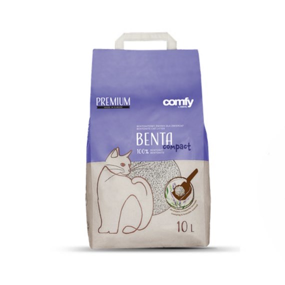Benta Compact – 100% natūralus bentonitinis kraikas Natūralus ir netoksiškas Benta Compact kačių kraikas pagamintas iš bentonito – naminiams gyvūnėliams saugios nuosėdinės uolienos, nesukeliančios alergijos. Jis yra labai sugeriantis, efektyvus ir puikiai šalina kvapus. Taip pat neutralizuoja bakterijų ir grybelių susidarymą. Jis pasižymi puikiomis sulipimo savybėmis, nesuyra ant kastuvo ir leidžia persijoti atliekas, todėl valymas labai paprastas. Be to, jis praktiškai nedulka ir neprilimpa prie kailio. Jis tiekiamas estetiškai patrauklioje popierinėje pakuotėje ir yra dviejų dydžių ir kvapų variantų – Benta Compact levandų (10 l) ir Benta Compact baby powder kačiukams (5 l). Jis buvo pagamintas ES. Puikus pasirinkimas katei ir jos globėjui Optimalus Benta Compact granulių dydis (0,5-2,5 mm) lemia daugybę gaminio eksploatacinių savybių. Svarbiausias iš jų yra didelis sugeriamumas, dėl kurio viena kraiko pakuotė sugeria net 20 litrų skysčio. Granulių dydis taip pat užtikrina mažą dulkių susidarymą, todėl galite lengvai palaikyti tvarką aplink katės tualetą. Kruopščiai suformuluota kraiko konsistencija skatina kapstymo instinktą ir skatina kates naudotis kraiko dėžute. Prekės savybės
