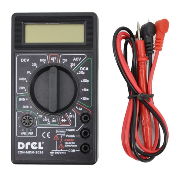 Techninės specifikacijos: DCV: 200mV – 1000V ACV: 200V – 750V DCA: 2000mA – 10A OHM: 200? – 2000K? Ekrano diapazonas: 1999 hFE: taip Diodų testas: taip O/P: taip Baterija: 9V 6F22 Matmenys: 126 x 70 x 28mm
