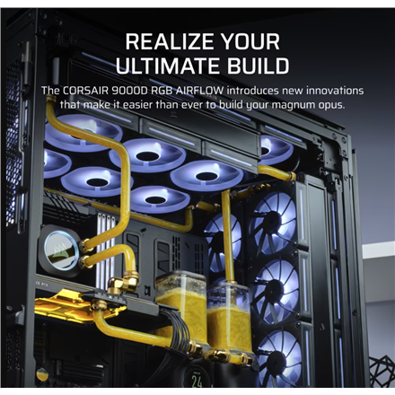 The Corsair iCUE 9000D RGB Airflow is a spacious Big Tower, optimised for the installation of high-performance hardware and ample airflow. Large radiators can be installed at multiple locations. The large Tempered Glass side door provides a perfect view of the interior and makes hardware installation and upgrades easier. The perforated right side panel is also attached to hinges.