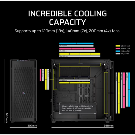 Extremely Spacious Full Tower, for motherboards up to E-ATX and SSI EEB/CEB, Tempered Glass side door, including iCUE controller, radiators up to 480 mm, up to 21 fans possible, graphics cards up to 400 mm in length, vertical expansion slots