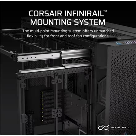 One of the standout features of the 9000D is the innovative InfiRail System. This modular mounting system gives you the freedom to place and adjust components as you see fit. Whether it’s hard drive cages, pump mounts, or radiators – you decide where everything goes. This flexibility is particularly helpful if you’re aiming for clean and efficient cable management or simply want to ensure your system looks exactly as you envision.