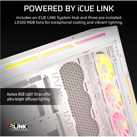 Three Corsair LX120 RGB fans and Aurora RGB Light Strips are included at the front. An iCUE Link Hub is included for controlling the RGB lighting.