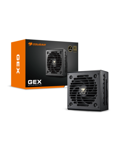 COUGAR GEX750 is an 80 PLUS Gold certified power supply unit that delivers 750 W of stable power for desktop PCs. Engineered for reliable operation at up to 40°C, it combines efficient power conversion, low noise and durable components — including 105°C Japanese capacitors — to provide steady electrical supply. The unit features a 120 mm active cooling fan, modular flat cables and support for standard PC connectors such as a 20+4 pin ATX motherboard connector, CPU and PCIe cables, and SATA connectors.