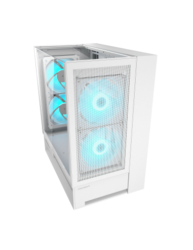The COUGAR Gaming OmnyX Midi Tower White is a mid‑tower PC case designed for flexible orientation and high airflow. Its omnidirectional chassis structure supports right, left or center placement and features dual transparent glass panels to display your build. The case comes preinstalled with four 160mm PWM fans (front and rear mirrored layout) and includes an integrated base compartment for hidden cable routing. OmnyX supports ATX, Micro‑ATX and Mini‑ITX motherboards, accommodates 2.5″ and 3.5″ drives, and fits GPUs up to 380mm in length. The white finish and side window illumination give a clean, modern look while the ambidextrous IO and universal fan hub simplify connectivity and fan/RGB control.