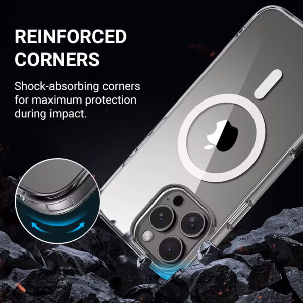 Clear protective case for iPhone 16 with built-in magnet for MagSafe charger and accessories. A magnetic ring hidden in the hybrid shell (consisting of 39 smaller magnets) makes the charger and other MagSafe accessories fit your phone perfectly every time.