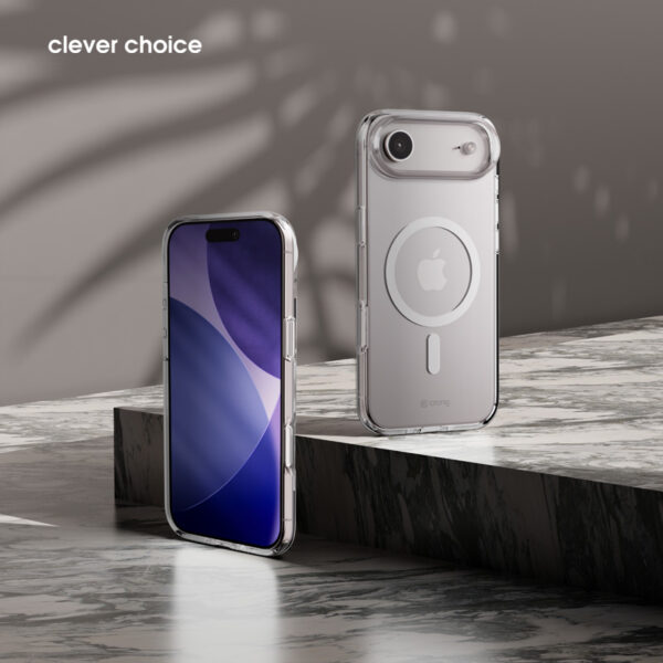 Clear protective case for iPhone Air with built-in magnet for MagSafe charger and accessories. A magnetic ring hidden in the hybrid shell (consisting of 39 smaller magnets) makes the charger and other MagSafe accessories fit your phone perfectly every time.