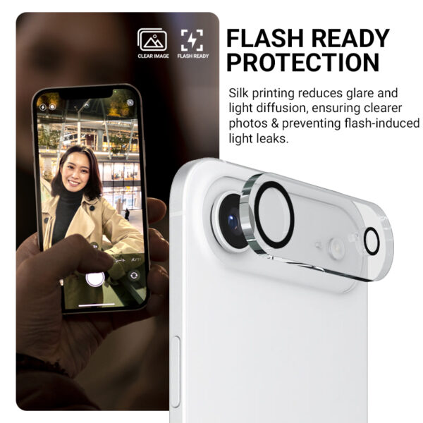 High-quality 9H screen protector glass for the main camera on iPhone 17. Unlike other products, Lens Shield™ offers an increased level of protection for the entire main camera, not just the lenses. The non-crumbling glass also maintains a uniform structure, so it does not hurt the fingers.