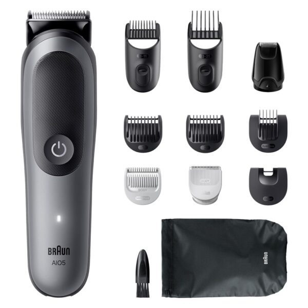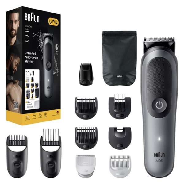 Prekės ženklas- Braun. Modelis- AIO5560 . Kirptuvo plotis- 40 mm. Spalva- Juoda, Pilka. Maitinimo šaltinis- Akumuliatorius. Akumuliatoriaus/baterijos tipas- Li-ion. Veikimo laikas įkrovus- 120 min. Ilgio nustatymų skaičius- 14. Antgalių skaičius- 9. Ilgio nustatymų diapazonas- 3 – 21mm. Galima plauti vandeniu- Taip. Pakrovimo lygio indikatorius- Taip. Besibaigiančios baterijos indikatorius- Taip. Su dėklu- Taip. Privaloma garantija- 24 mėn.